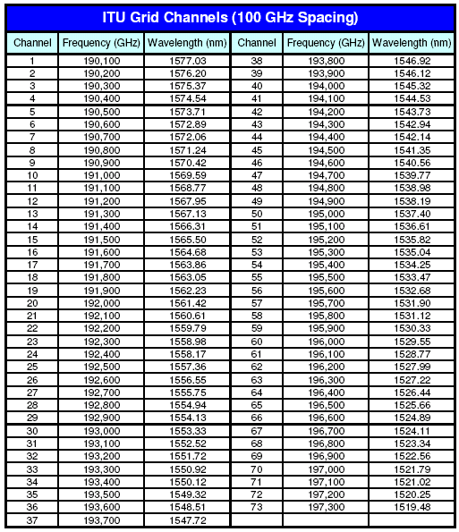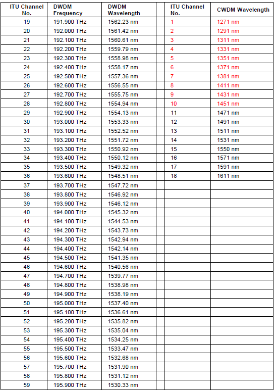 De algemene benaming voor lichtdraaggolven is Lambda's. De meest toegepaste Lambda's zijn in de 850, 1310 nm en 1550 nm bandbreedte. Internationaal zijn afspraken gemaakt over de Lambda kanaalindeling, het ITUgrid toont de gestandaardiseerde kanaalindeling voor de 1550 nm bandbreedte. Voor HFC optische draaggolven worden specifieke kanalen geselecteerd om onderlinge verstoring tussen de optische draagolfkanalen tot een minimum te beperken. Over het algemeen worden wordt gekozen voor even of on-even kanalen bij toepassing van 1550 nm kanalen. Dit komt neer op een afstand van 200 GHz (1,66 nm) tussen de kanalen. De draaggolf kanaalkeuze kan echter per fabrikant verschillen. Bij gebruik van 1310 nm kanalen is de afstand tussen de kanalen 3441 GHz (20 nm).