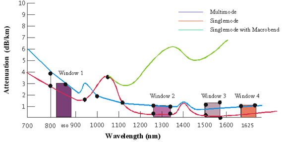 Duidelijk is te zien dat singlemode glasvezel aanzienijk beter presteert dan de multimode glasvezel. Hieronder een opsomming van de demping bij de meest gebruikte lichtfrequenties.