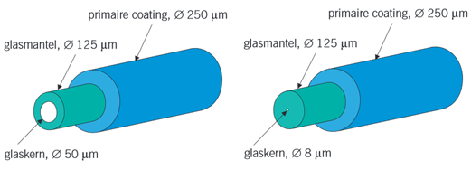 Bij multimode glasvezel in het linkerplaatje is de glaskern dikte 50µm (micrometer) en bij singlemode is de glaskern dikte 8µm. De totale dikte van het glasgedeelte van de glasvezel 'core' plus 'cladding' is 125µm. Inclusief de kunstoflaagje is de totale dikte van de glasvezel 250µm. De dikte van een mensenhaar is ongeveer 50 μm (=0,05 mm).