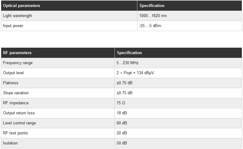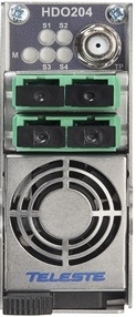 Hieronder de specificaties van een optische up-stream onvanger in HDX formaat met vier optische ontvangers van de firma Teleste.