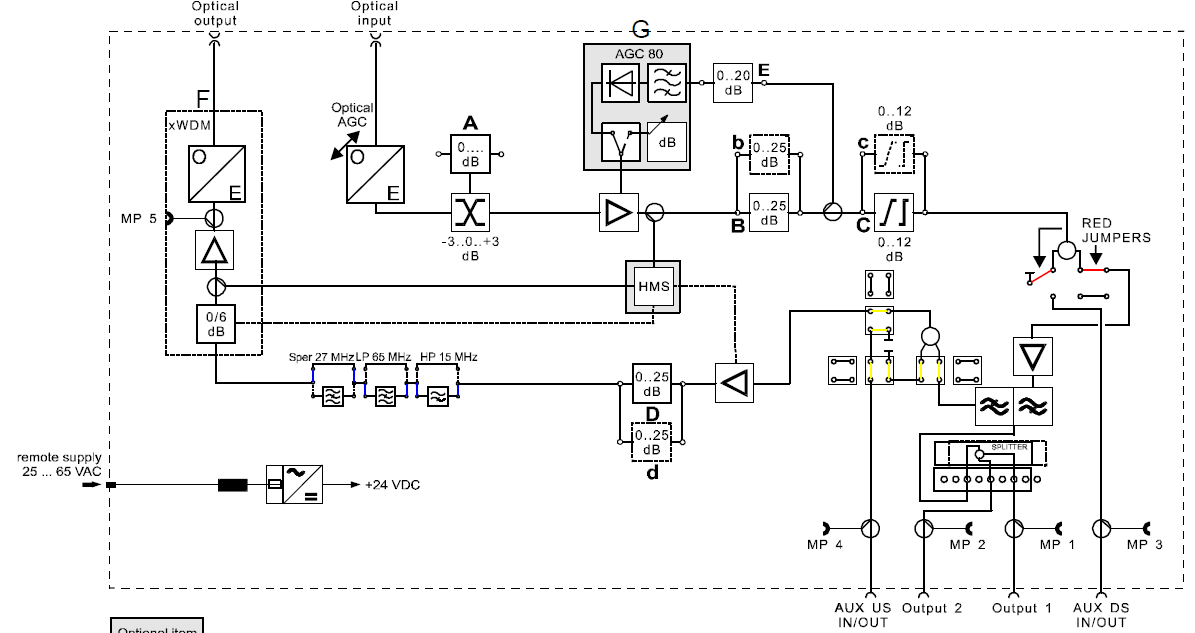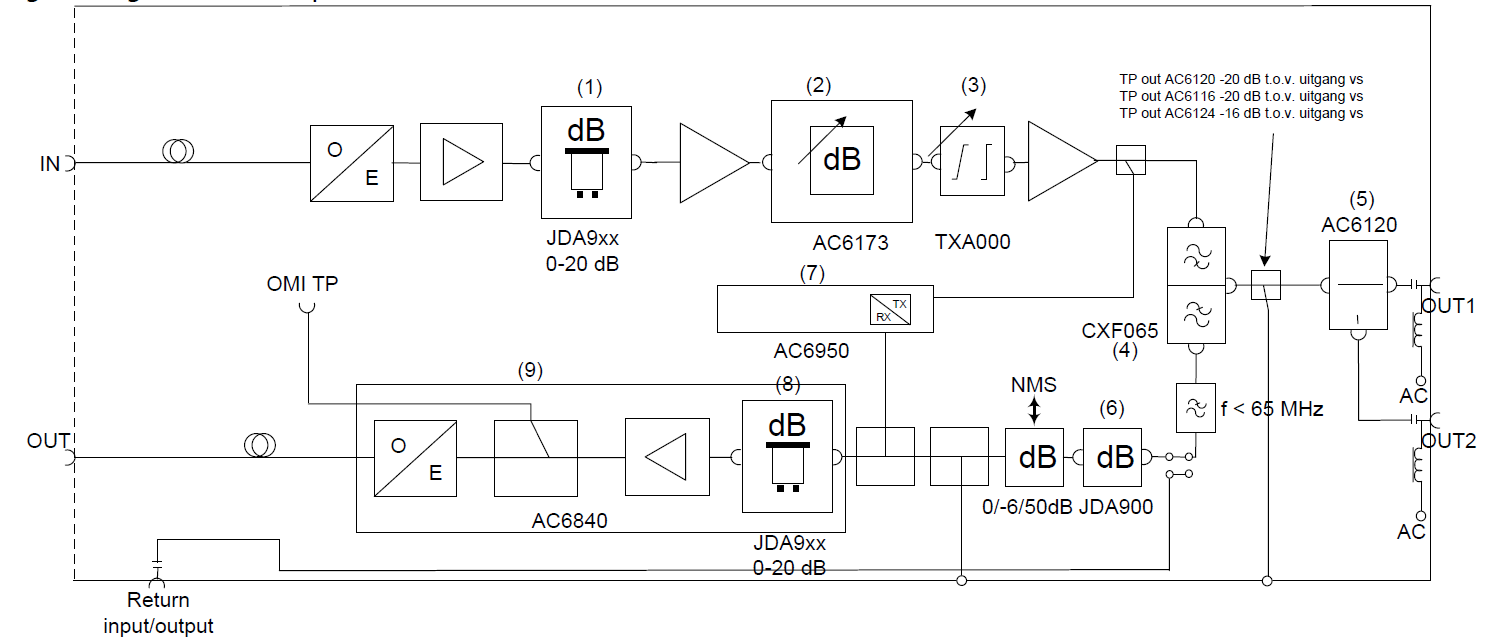 Aan de linkerzijde kunnen vier glasvezels worden aangesloten t.w. broadcast IN#1 t/m IN#4. De fotodiodes demoduleren de lichtdraaggolven, waarna de RF draaggolven door RF versterkers op een gewenst niveau gebracht kunnen worden en beschikbaar zijn op de individuele uitgangen OUT#1 t/m OUT#4.